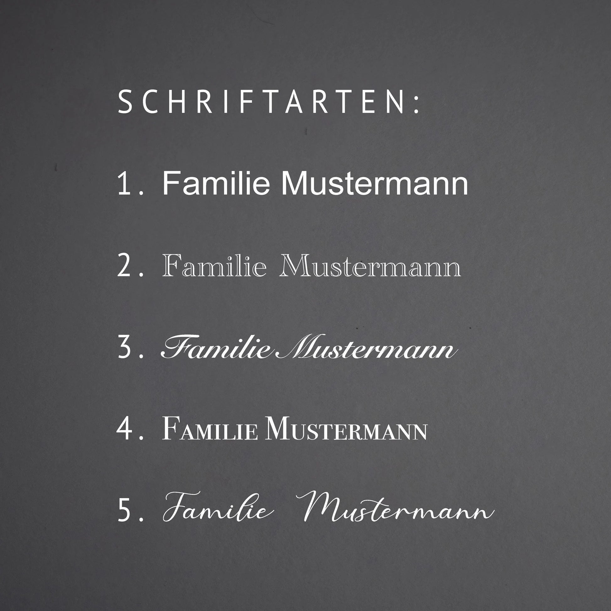 Die Montage ist jetzt noch einfacher und unkomplizierter, denn unsere personalisierten Tür- und Klingelschilder aus Kunststoff sind selbstklebend. Einfach die Schutzfolie abziehen und das Schild an der gewünschten Stelle anbringen - fertig! Ob an der Tür, am Briefkasten oder an der Klingel (für nicht haftende Untergründe bieten wir die zusätzliche Option mit Schraublöchern an) - unser selbstklebendes personalisiertes Tür- und Klingelschild macht überall eine gute Figur.