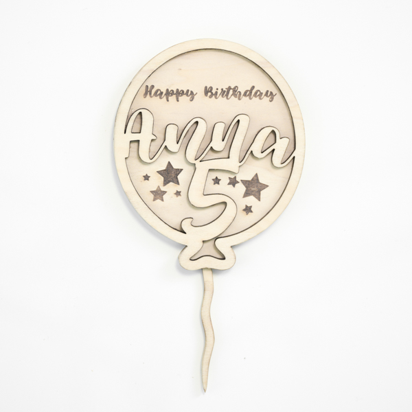 • Personalisierter Cake Topper aus Holz “Luftballon mit Wunschname, Zahl & alternativem Text”